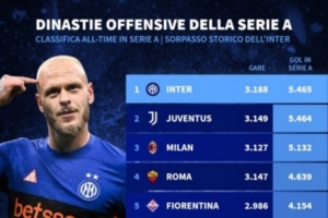 体育资讯4月13日讯 德国转会市场统计了各队在意甲的历史进球总数量,并列出榜单,国米打进5465球,超越尤文居首。