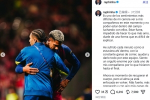 体育资讯4月15日讯 巴萨在本轮欧冠八强战主场0-2、客场2-1,总比分2-3被马竞淘汰,期间有多次争议判罚引发巴萨球员不满。在国家队友谊赛受伤而因伤缺阵的拉菲尼亚赛后通过社媒发文: