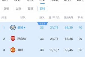 此役后,曼城积70分追平阿森纳,两队均赛33场的情况下,净胜球都是37个,曼城进球数66,阿森纳进球数63,因此曼城登顶!