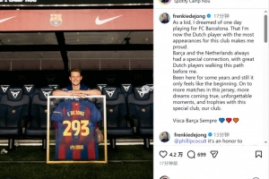 德容社媒晒出与293场纪念球衣的合照,并写道:“小时候,我就梦想着有朝一日能为巴萨效力,如今我已经是为这家俱乐部出场最多的荷兰球员,这让我感到自豪。