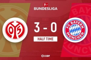 体育资讯4月25日讯 北京时间4月25日晚上21:30,德甲第31轮,拜仁慕尼黑做客欧宝竞技球场挑战美因茨。上半场,D·科尔凌空斩,内布尔破门,乌尔比希屡献神扑,贝克尔再下一城。半场比赛结束,拜仁慕尼黑0-3美因茨。