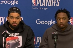 唐斯:是的,这也是一个很好的观察。我认为今天和之前的不同之处在于,我感觉自己在这个系列赛里的组织做得不错,但与其试图把队友带到某个位置,我只是把球传到他们所在的位置,让他们自己做决定。我觉得这在今天帮了我大忙,更早地把球交给队友,让他们做决定,然后他们能把球投进。所以,就是在组织方面保持侵略性,并在拿到球时努力打好控球后卫的角色。
