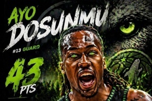 43分也是道苏姆的生涯新高,他常规赛纪录是35分,季后赛之前的纪录是上一场的25分。