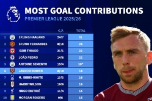 体育资讯4月27日讯 德国转会市场统计了本赛季球员在英超的参与进球数量,并列出榜单,哈兰德31球居首,B费26球次席。