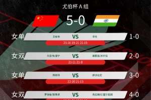 体育资讯4月28日讯 2026年汤尤杯小组赛,中国5-0横扫印度小组头名晋级淘汰赛。