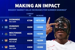 体育资讯4月28日讯 德国转会市场列出了去年夏窗签约球员身价上涨排名,扬·迪奥曼德上涨7350万欧居首、武什科维奇上涨4800万欧次席。
