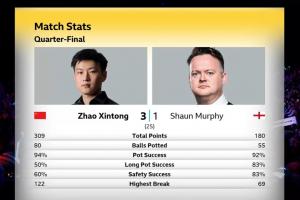 斯诺克世锦赛1/4决赛第一阶段上半场:赵心童3-1领先墨菲