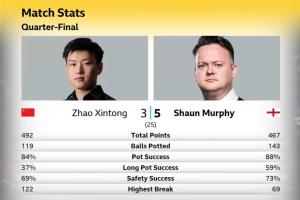 体育资讯04月28日讯 2026斯诺克世锦赛1/4决赛,赵心童第一阶段3-5落后肖恩·墨菲,两人第一阶段数据对比如下。
