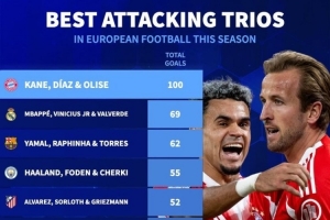 本赛季欧洲三叉戟各项赛事总进球榜: