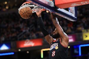无大碍!恩比德腿部被杰伦·布朗顶了一下 简单调整后返场作战