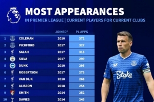 体育资讯4月29日讯 德国转会市场统计现役球员当前俱乐部的英超出场次数,并列出榜单,科尔曼、皮克福德、萨拉赫前三。