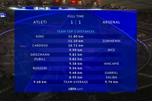 马竞平均跑动9.68公里,阿森纳平均跑动9.74公里