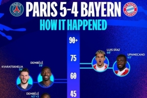 战拜仁独造三球!官方:登贝莱当选欧冠半决赛首回合MVP